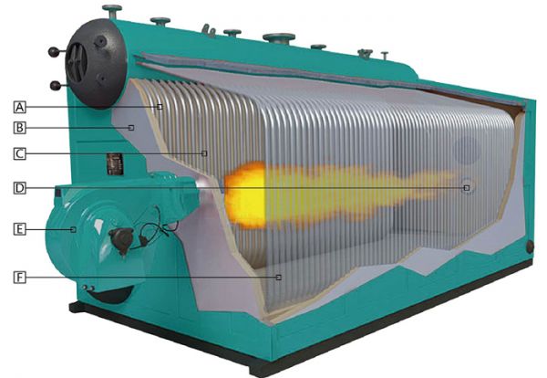 燃油、燃气、燃煤经过燃烧产生高温烟气释放热量,高温烟气先进入炉膛,再进入前烟箱的余热回收装置,接着进入烟火管,最后进入后烟箱烟道内的余热回收装置,高温烟气变成低温烟气经烟囱排入大气。由于余热锅炉大大地提高了燃料燃烧释放的热量的利用率,所以这种锅炉十分节能。